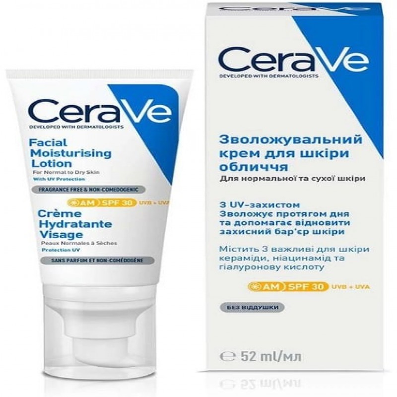 Денний зволожувальний крем CeraVe для нормальної та сухої шкіри обличчя із SPF30 52 мл (333787584062 525.0 ₴ |